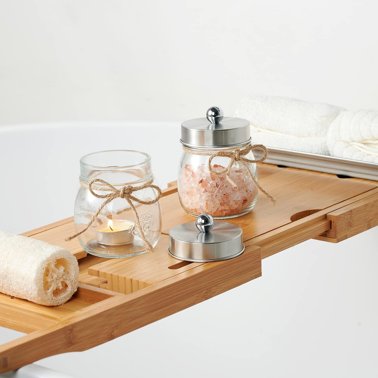 - ✔️Easy to Open and Close: This bathroom set includes two 8-ounce glass mason jars with standard-size metal lids. Perfect for any bathroom and they are small enough to fit neatly and keep by the sink and not get in the way or make the counter look cluttered. These lids provide a secure fit, an easy-open design, and rust-resistant properties. Please note: the lids are designed for a lift-off mechanism rather than a screw-on closure. It makes it so much easier to lift off the top and reach in for a cotton ball or cotton swab.