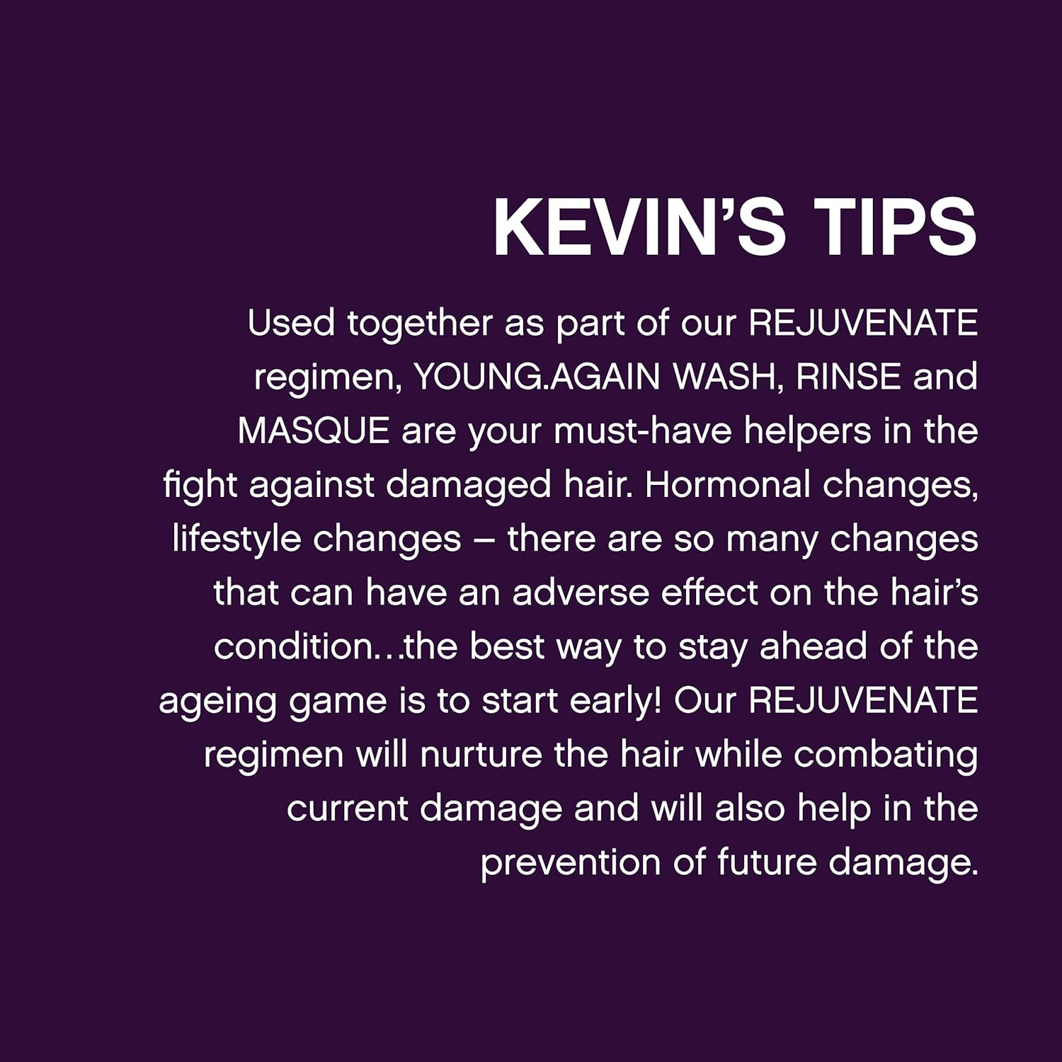 - Restorative & Anti-Ageing Conditioner: YOUNG.AGAIN.RINSE anti-ageing conditioner smooths frizz and restores shine to ageing, brittle and damaged hair