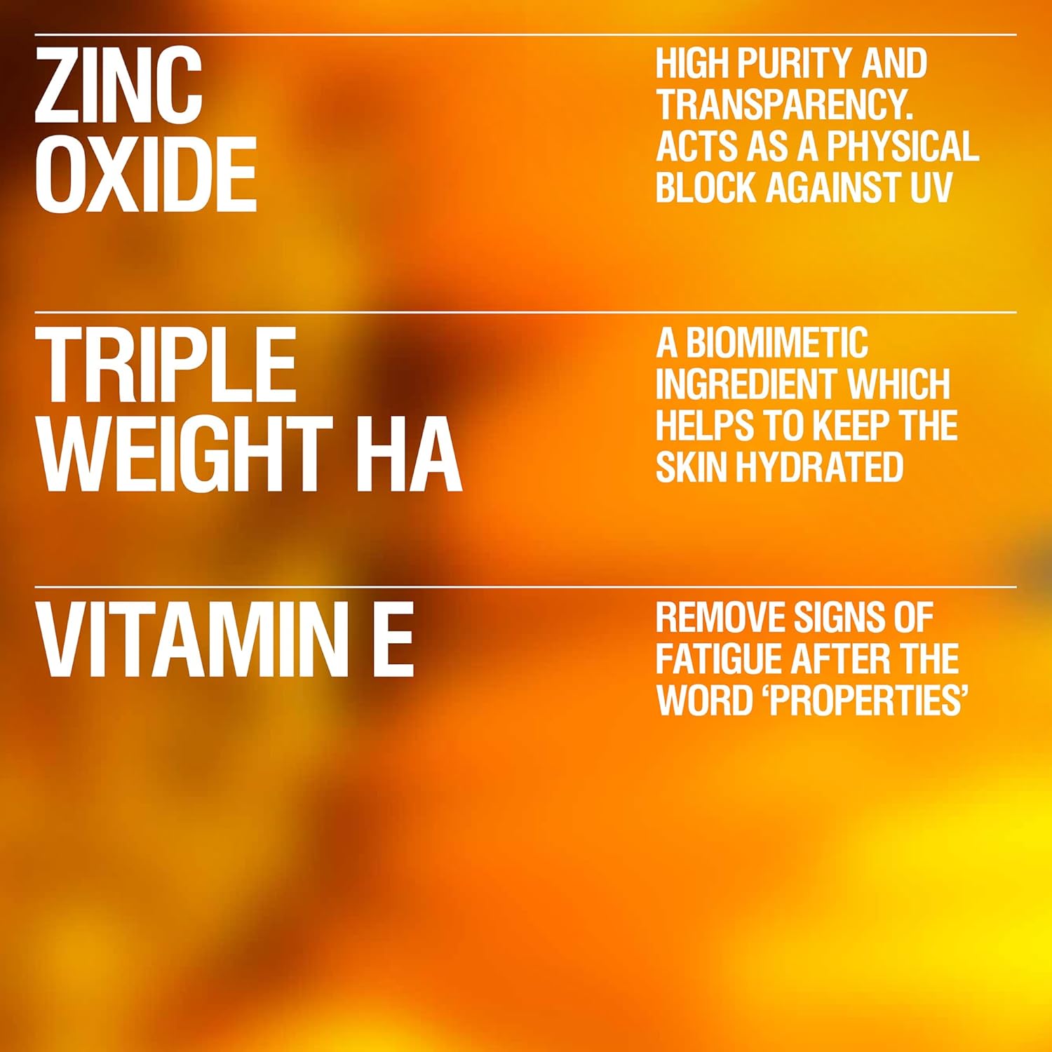 - HYALURONIC ACID: in 3x molecular weight (high/medium/low) for deep hydration & Rosehip Oil for soothing, calming skin