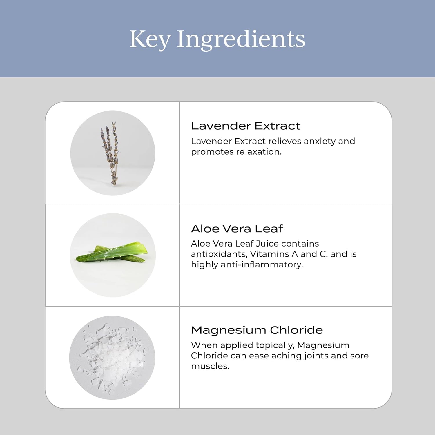 - PLANT BASED INGREDIENTS: Our magnesium body spray is crafted with pure plant based ingredients which can provide multiple health benefits. Included in our formula is lavender extract known for its calming properties, and aloe vera leaf juice which is enriched with antioxidants as well as vitamins A and C which can support overall well-being.