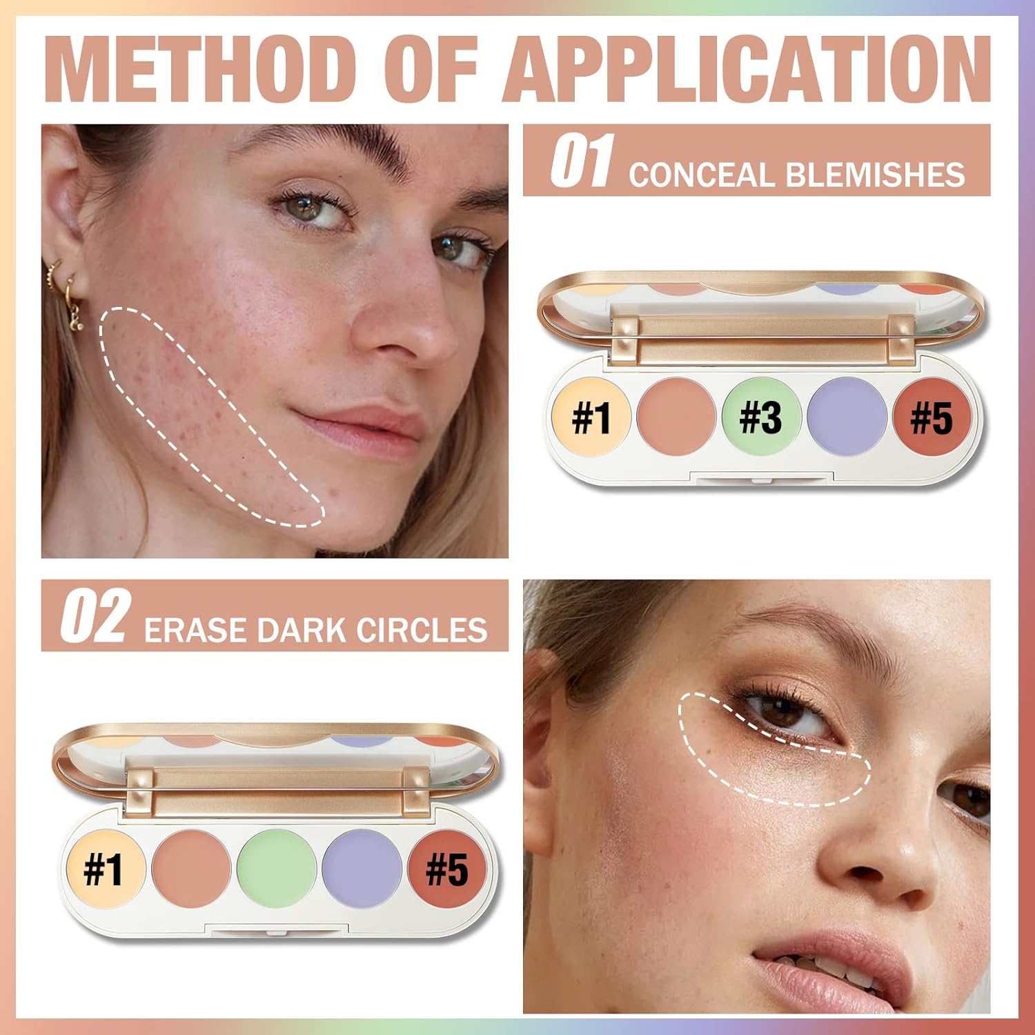 FOCALLURE #GoldenAge 5 in 1 Multi Uses Concealer Palette, 5 Colors Correcting Conceal Palette, Camouflage Contour Palettes for Dark Circles, Face Contouring Highlighter Pallet, CC02 COLOUR CORRECTING