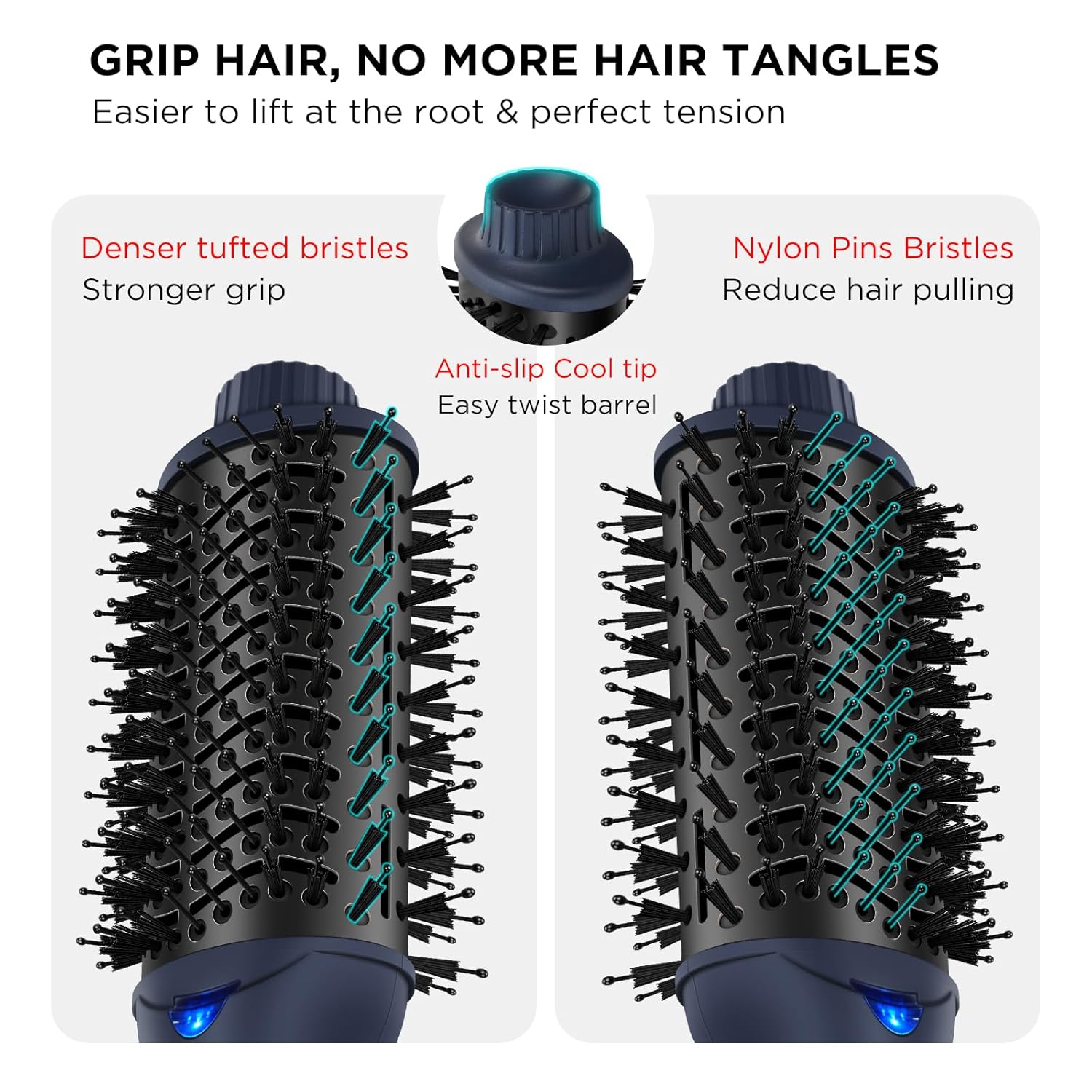 - 【Professional 4 In 1 Function】: In addition to a hairdryer and curler brush, our oval brush hair dryer also straightener and brush. Suitable for all ages and hair types, like long hair, and curls. Besides, one step hair dryer & styler is designed with Nylon Pins & Tufted Bristles for easy detangling & better grip of your hair. The ergonomic handle is designed for maximum comfort and ease of use during styling.