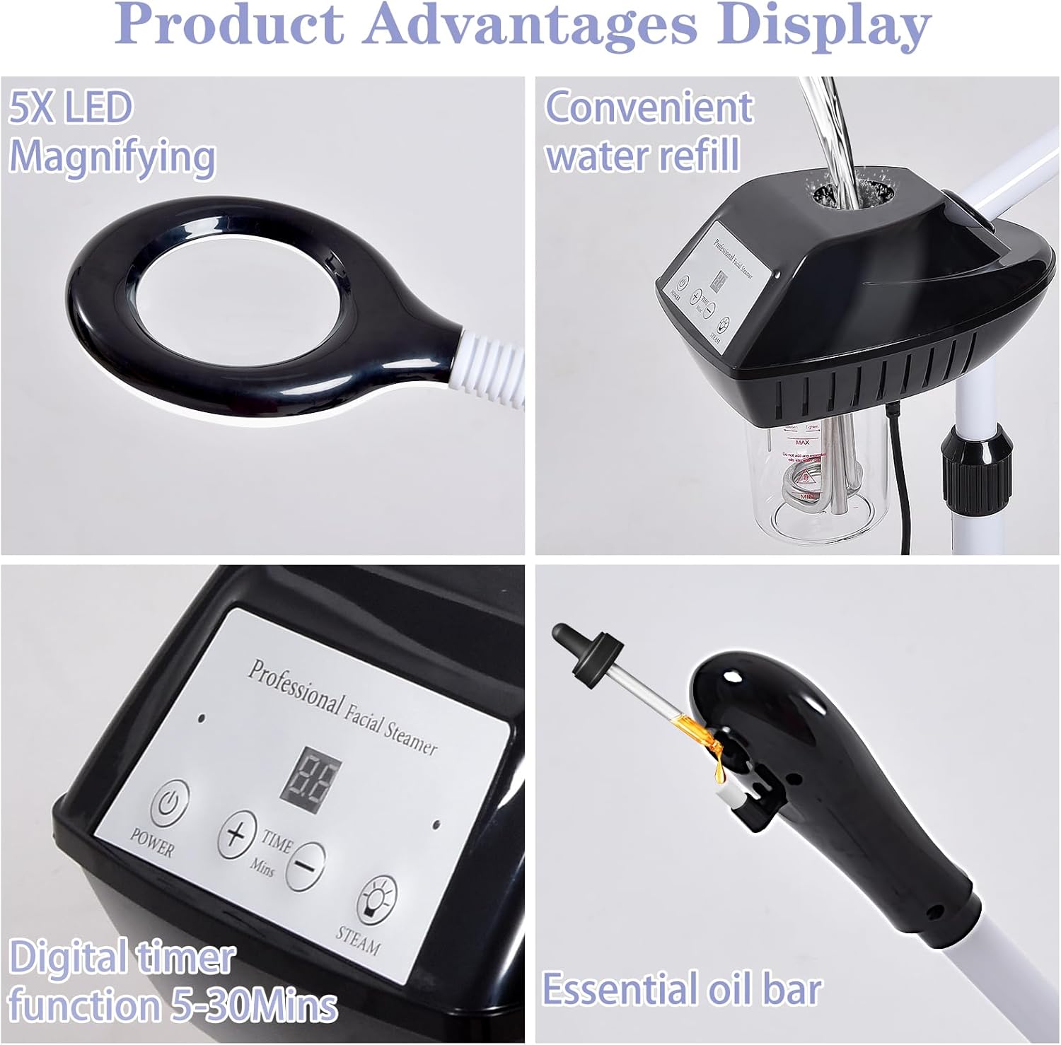 - 【Facial Steamer Professional】The facial steamer comes with an upgraded atomizing cartridge, removable 500 ML water cup, 36-52 inch adjustable height, 360° rotating nozzle, and 360° rotating body.