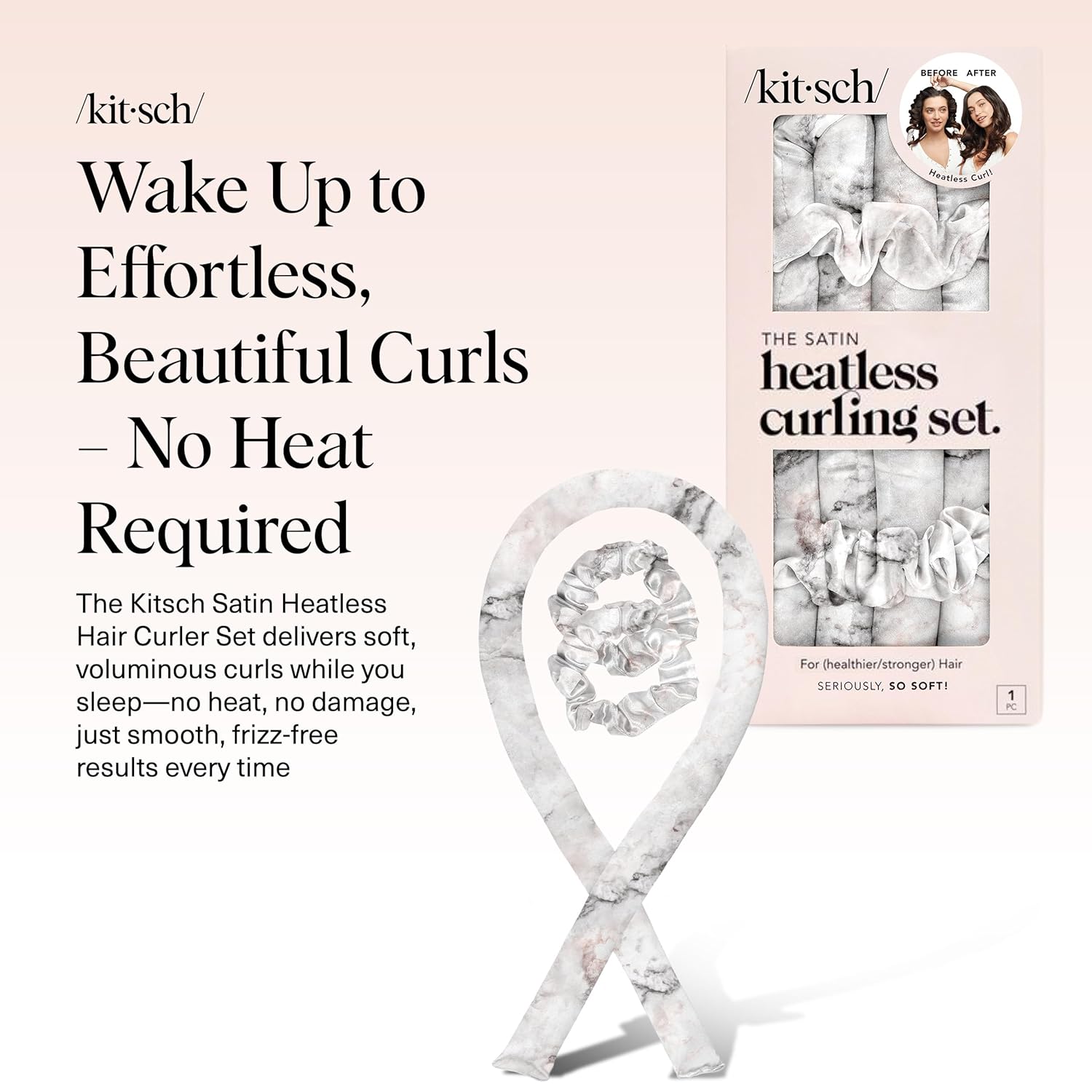 - BYE-BYE HAIR DAMAGE: Protect your hair from heat damage with the Kitsch Overnight Hair Curler. This set includes a curling rod and two satin scrunchies, all wrapped in premium satin fabric to keep your hair smooth and frizz-free while creating gorgeous, heat-free curls.