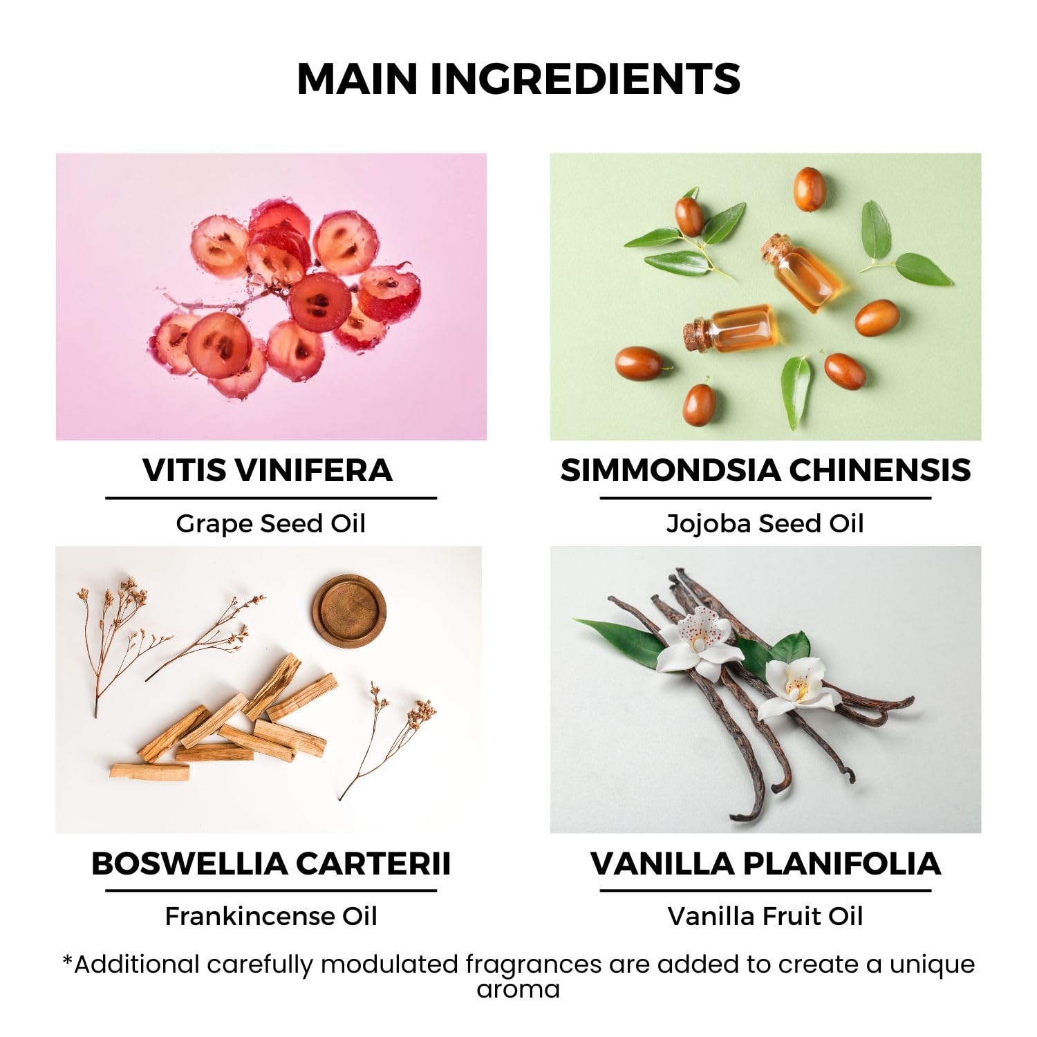 - Scent: Frankincense, rose, vanilla, elemi, myrrh, sandalwood