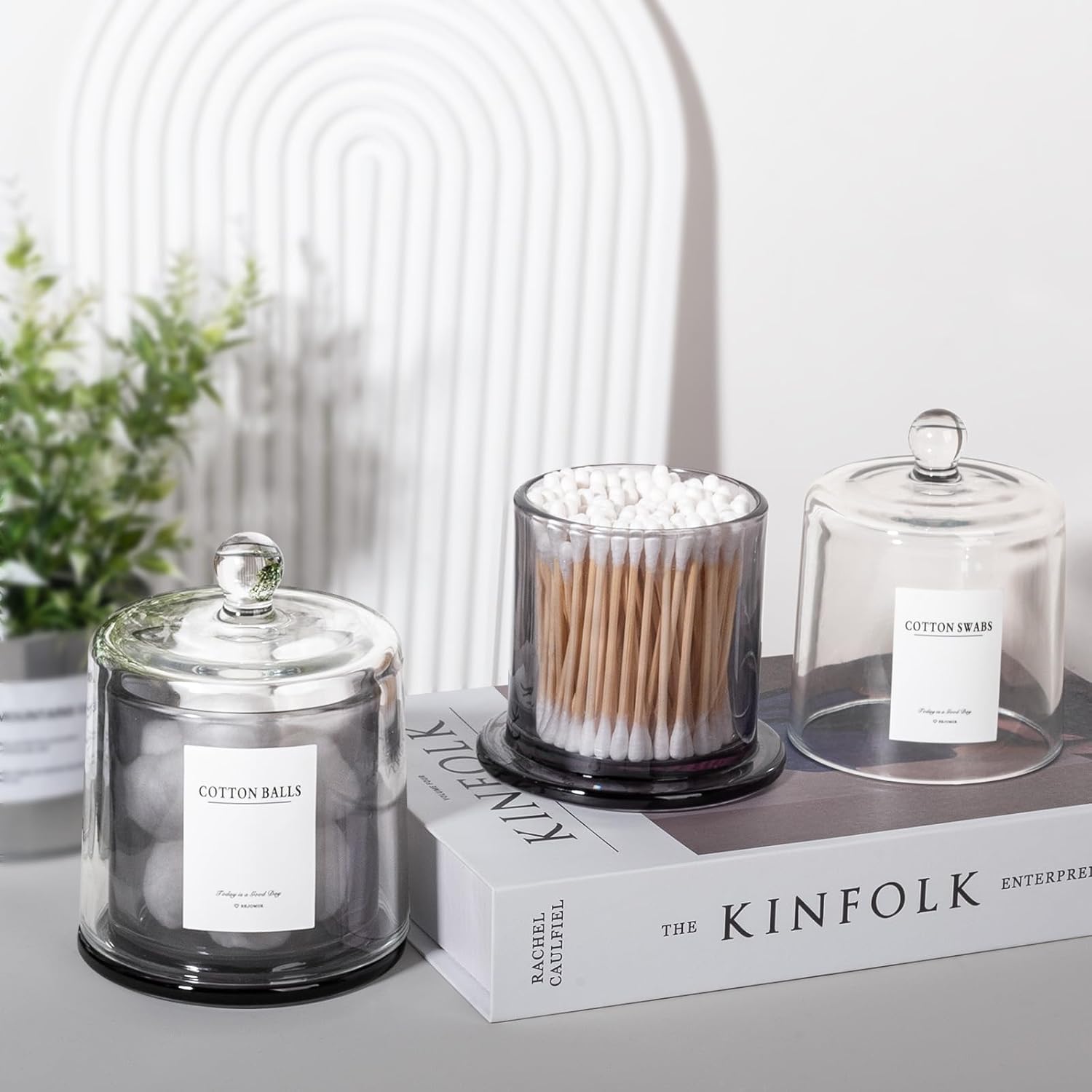 rejomiik 2 Pack Qtip Holder Thick Glass Apothecary Jars with Lid for Bathroom Accessories Vanity Organizers and Makeup Storage for Cotton Ball, Swabs, Makeup Sponges, Candy, Jewelry, Grey