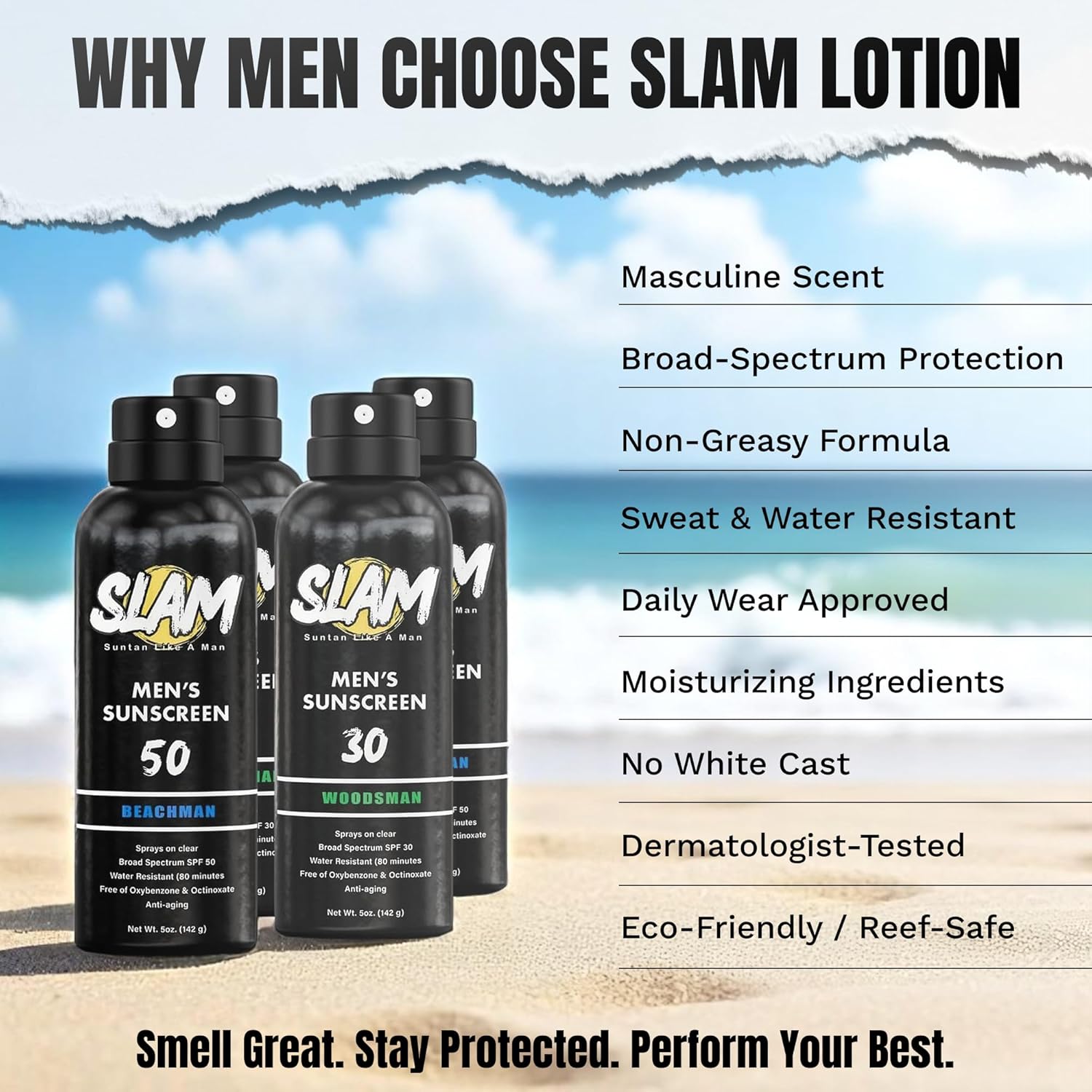 - Manly Teakwood Scented Sunscreen Spray: Embrace the rugged aroma of teakwood with this men’s sunscreen spray. Slam Lotion WoodsMan SPF 30 sun screen spray keeps you protected and smelling great on every outdoor adventure. The perfect size sunscreen spray.