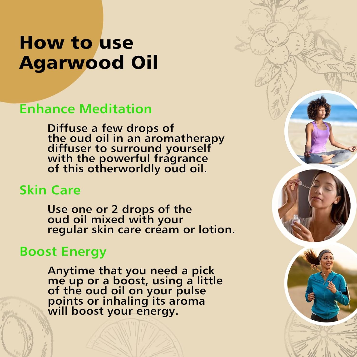 - Agarwood Oil is steam distilled from aquilaria wood. It can be used in many areas and has great benefits. You can add a few drops in a diffuser to create a peaful environment. For topically use, dilute with carrier oil before use
