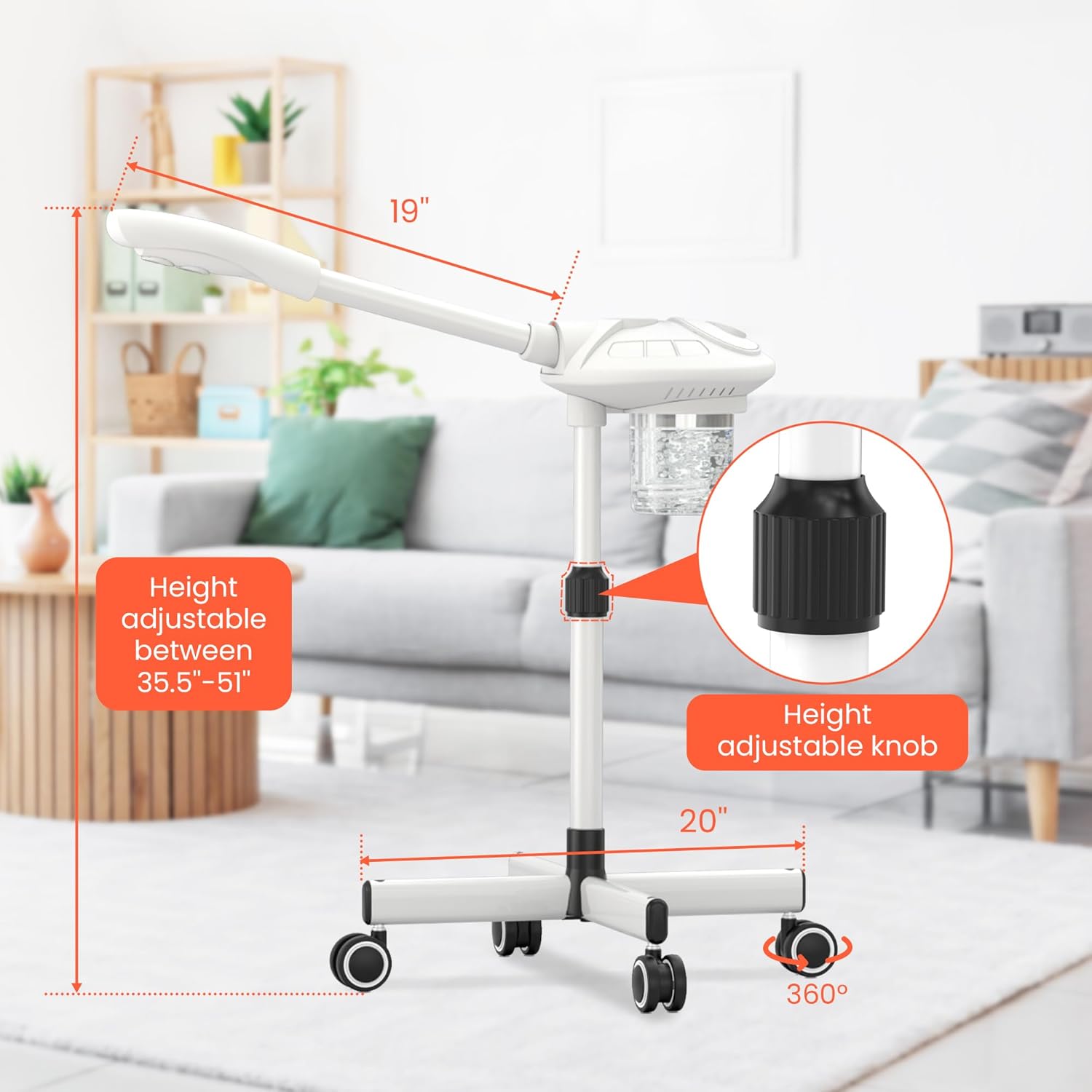 - Rolling Design:The standing facial steamer Equipped with free-moving wheels, it is easy to move and suitable for various locations such as homes and salons. Whether at home or in a beauty salon, it can be easily moved to the desired position, making it more flexible and convenient to use.