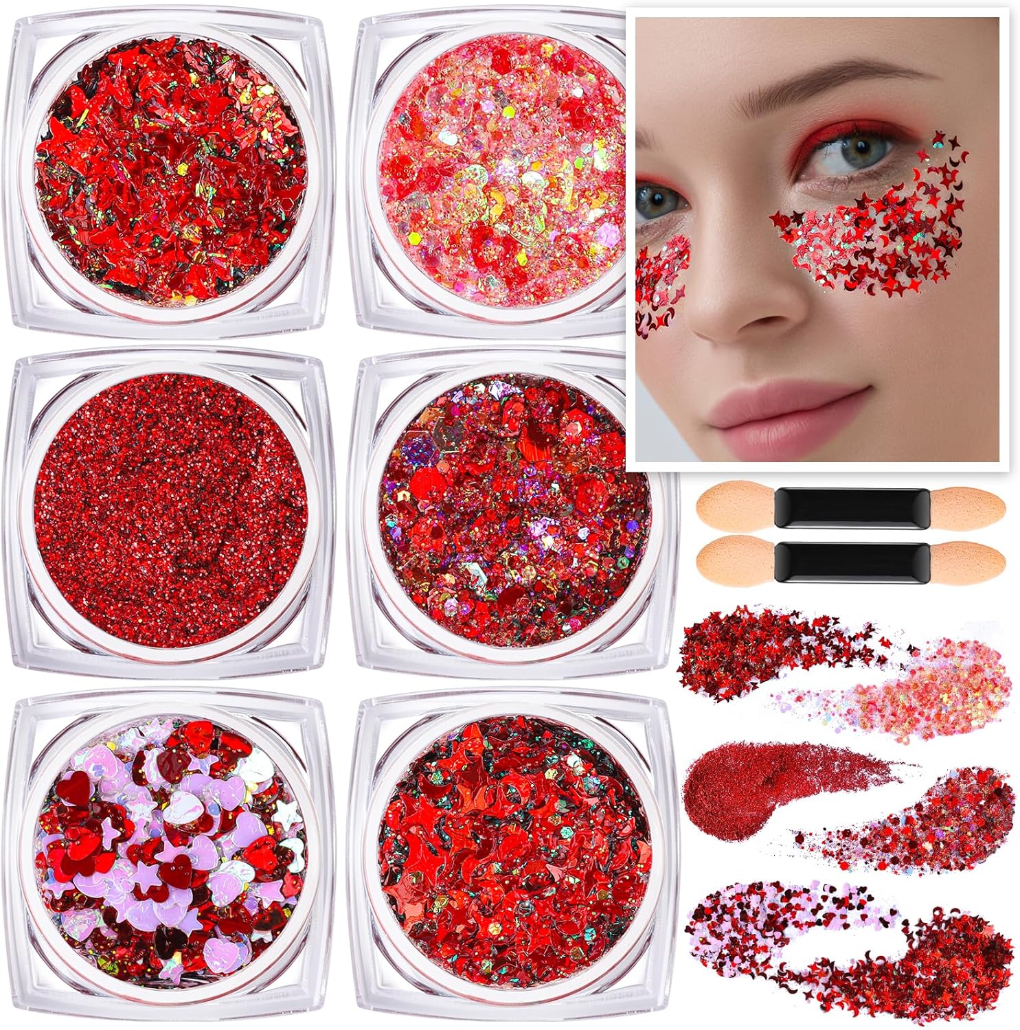 - 6 SHAPES BODY GLITTER GEL - This red body glitter set included very fine glitter, hexagon glitter, the stars and the moon glitter, butterflies and love heart glitter, shining shredded paper glitter, four-angle star glitter. This is a great set of six different glitters that are all different sizes of red glitter