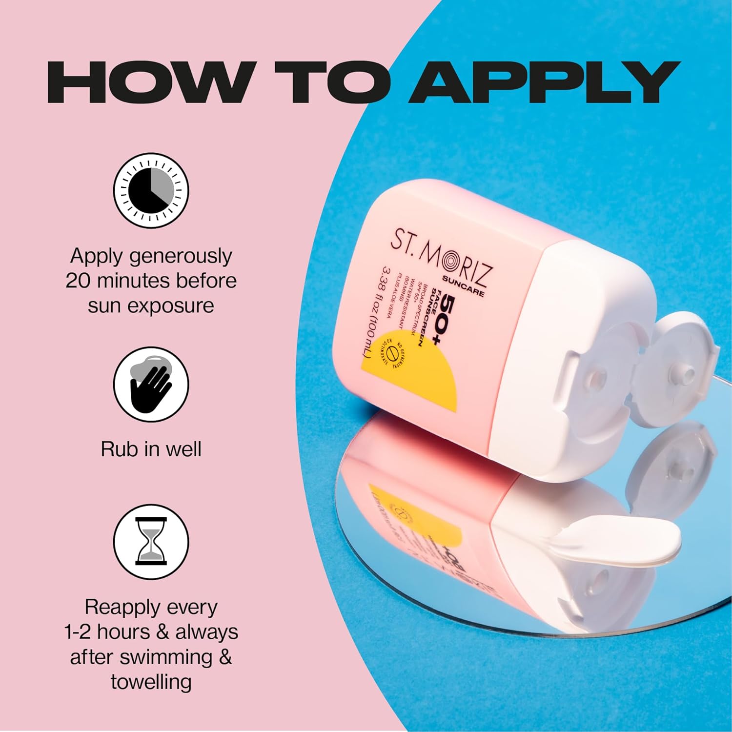 - HOW TO USE: Apply liberally 15 minutes before sun exposure. Reapply: After 80 minutes of swimming or sweating. Immediately after towel drying. At least every 2 hours.Being safe in the sun shouldn't be boring! Our daily use, broad spectrum protection formulas combine sunscreen & skincare to future-proof your skin! Use St. Moriz Suncare alongside St. Moriz Self Tan for a sun safe glow.