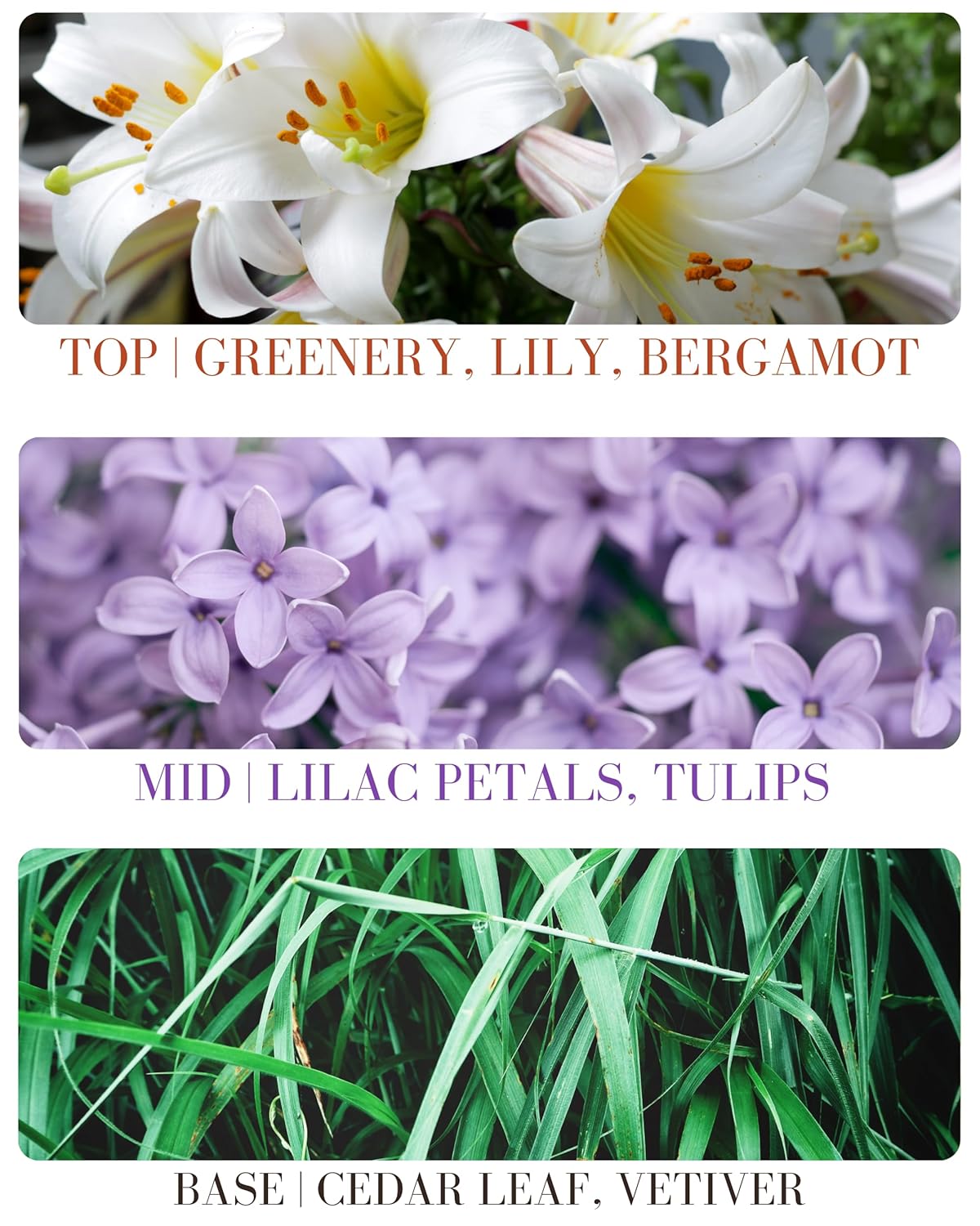 - SCENT PROFILE - TOP: Greenery, Lily, Bergamot MID: Lilac petals, Tulips BASE: Cedar leaf, Vetiver.