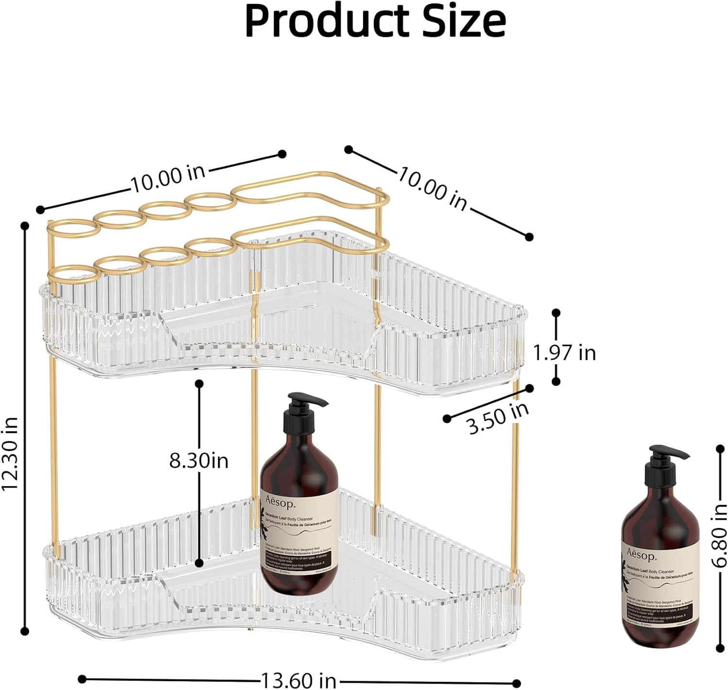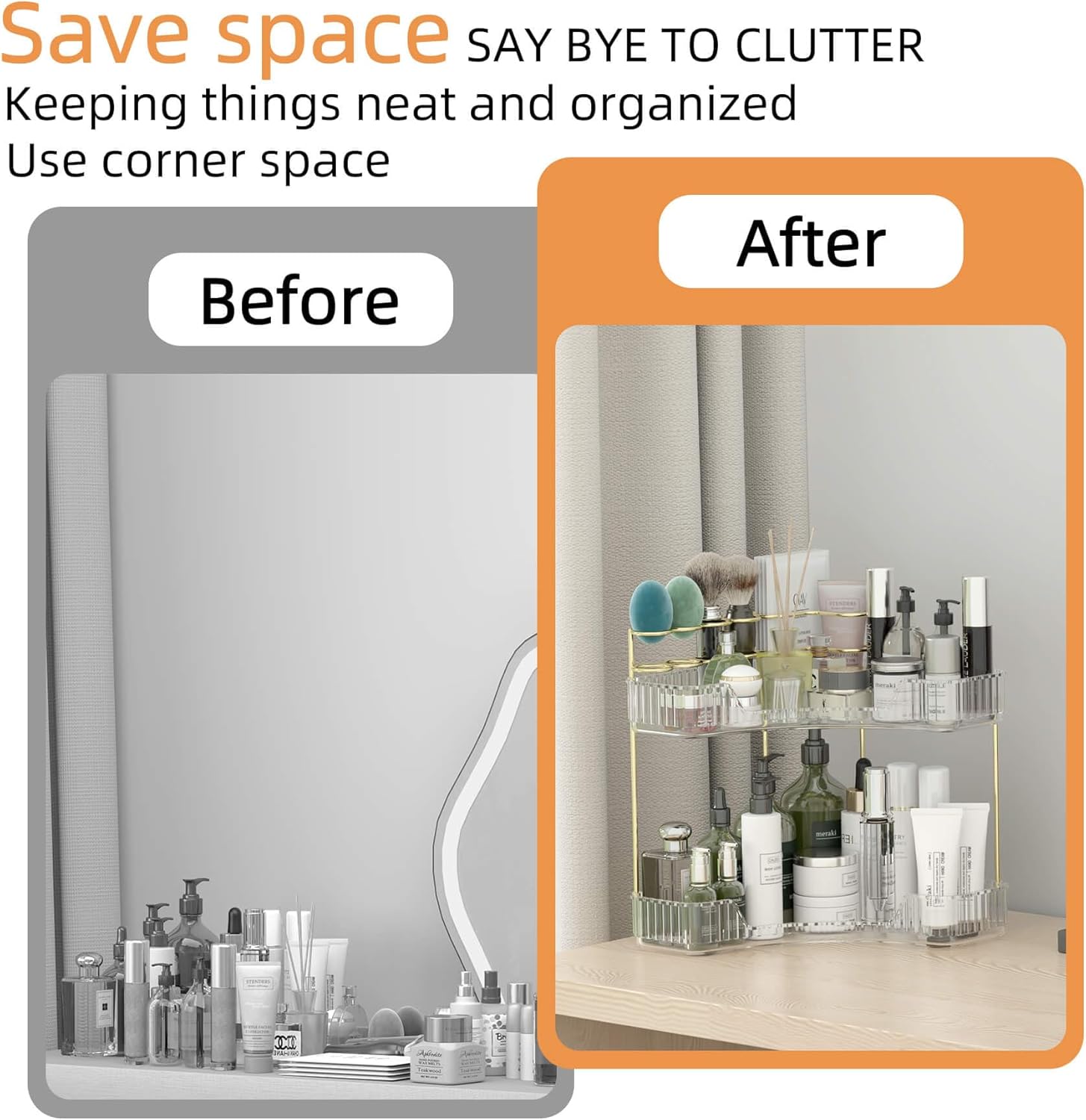 Makeup Organizer Countertop 2 Tier, Corner Bathroom Countertop Organizer with Toothbrush and Makeup Brush Holder, Corner Vanity Tray for Skincare Organization