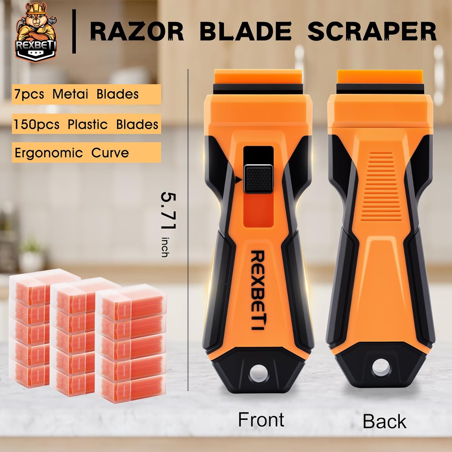 REXBETI Razor Blade Scraper Tool, 1 Pack Razor Scraper with Extra 157Pcs Razor Blades -7Pcs Metal and 150Pcs Plastic Blades, Cleaning Scraper Tool, Cooktop, Paint, Glass Scraper