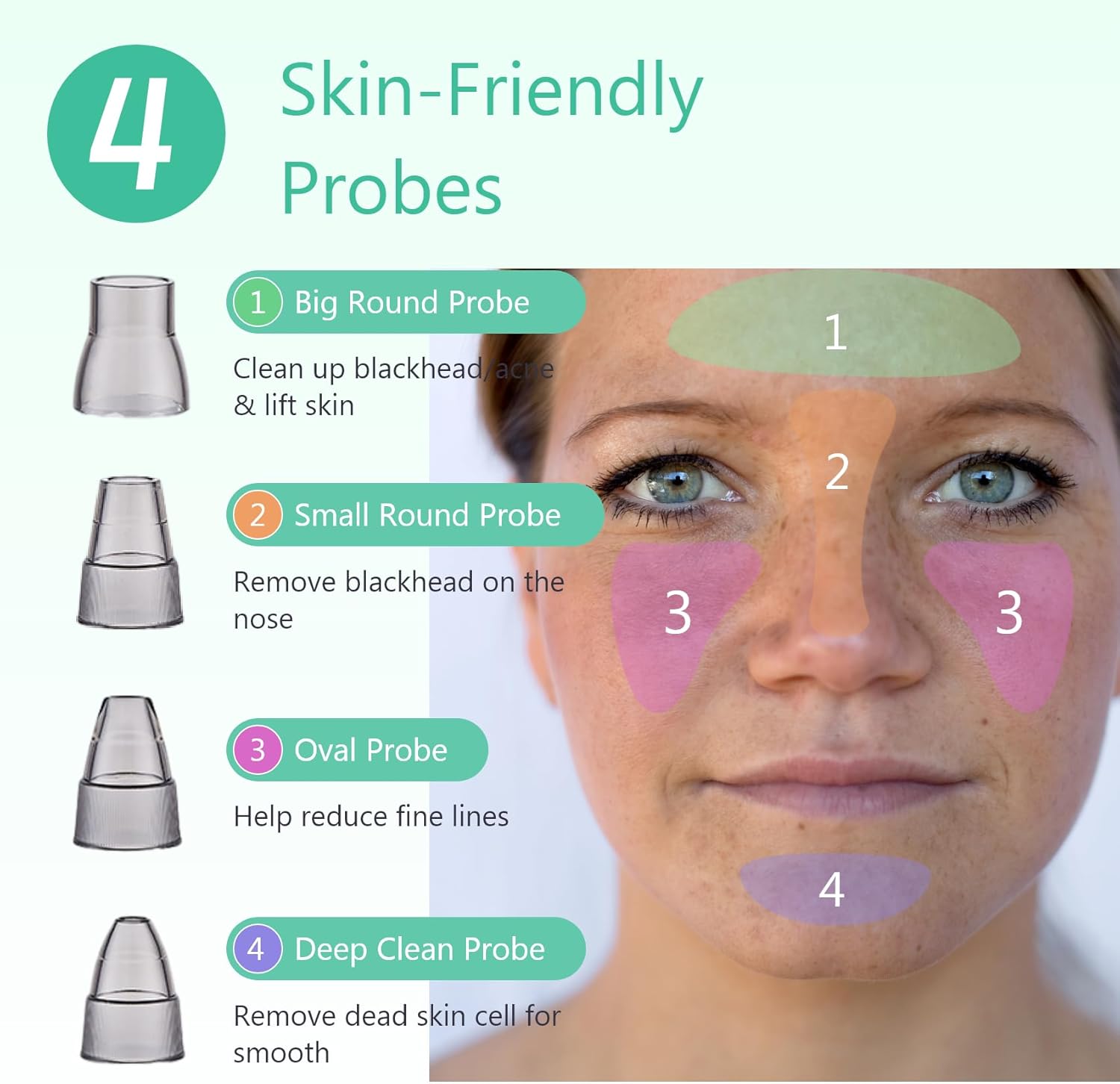 - Tips:Our Blackhead Remover Vacuum with 4 pcs interchangeable suction heads and includes 4 pcs bonus pimple popper tools. They can be rinsed with water to keep them clean