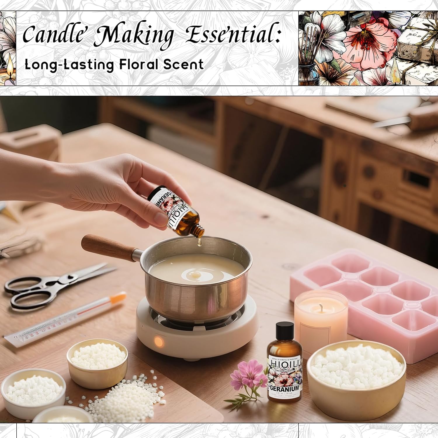 HIQILI Geranium Fragrance Oil for Home Diffuser, Relaxation, Essential Oil for Candle & Soap Making, Long-Lasting Scents, Car Freshies - 1 Fl Oz