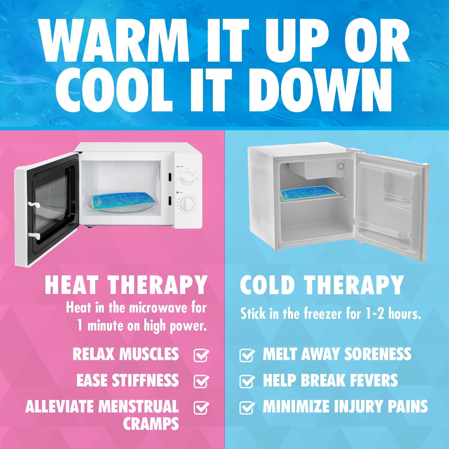 - VERSATILE, COMPLETE SET: Tackle pain from all angles with a rectangle gel ice pack, available in blue or pink, for covering larger areas. Use hot or cold therapy to ease sore muscles, support recovery, and bring comfort after workouts or long days.