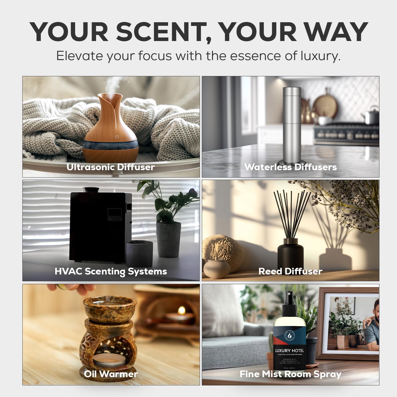 - Luxury Hotel Essential Oil for Aromatherapy โ Designed to elevate your mood and reduce stress, this hotel scent diffuser oil brings calm and comfort to your space. A relaxing and refined addition to your aromatherapy routine.